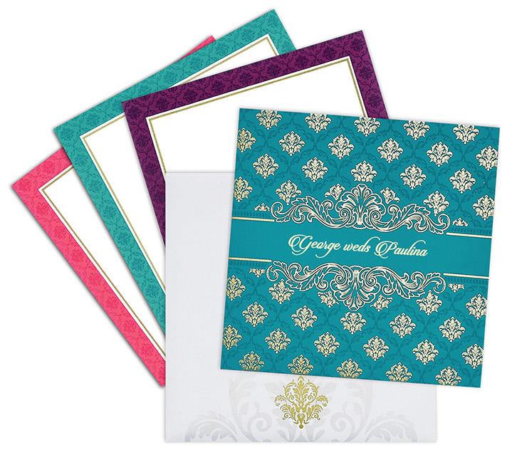 Designer invitation in turquoise color with nicely design motif on front, space to put initials or symbols as required on front folder, two color inserts with nice colorful border and theme is made on card stock texture sheet. Extra inserts are available as required. Free text printing is available with two inserts and text if required to print on envelope.