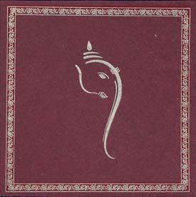This card is made of glistering handmadepaper decorated by golden floral and embossed golden motif of the propitious 'Lord Ganesha' The interleaves and the envelope are in cream colored handmadepaper and the envelope is decorated by the same floral border and ganesha motif.