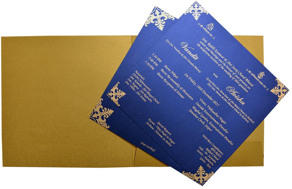 The best revenge is to select perfect design for massive appreciation and success. Made from Royal blue color shimmery finished card stock sheet, this attractive design available with a perfectly matched envelope and two inserts. Extra inserts are available as required with its color preference. Theme base pattern of the envelop gives a touch to all your expectation about the invitation. Two inserts are part of invitation with its folder and envelope and extra inserts are available as required.
