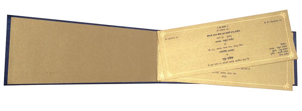 Designer House Warming Ceremony Cards with traditional & modern concept, available to invite your guest & relatives. This design is online in nice golden shimmery finish sheet material.