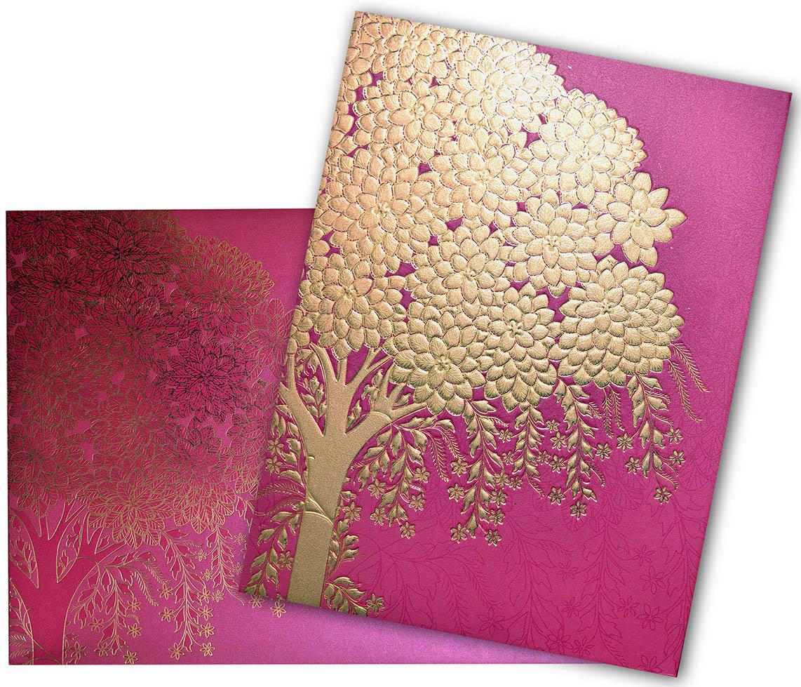 From your wedding card design to seating directions, paint a pretty picture with a wedding saying that’s as adorable as your flower girl or as sweet as a rose. This hot pink color design has a same story with golden foil printed emboss pattern on front available with box envelope, thick double pasted folder and thick inserts with nice pastel shades, full of colors to fill the wedding celebration. Shimmery finish high end material is being used to make this exclusive pattern.