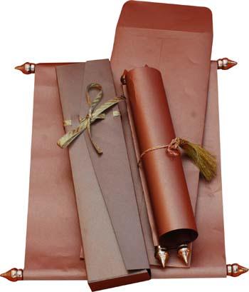 For occasions as special as a wedding,introducing a range of exquisitely scroll invitation,in metal bronze ore with perfect color combinations as matching box and envelope.Making a most precious invitaion for you to select sets the standards of performance and expressions.