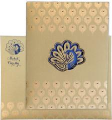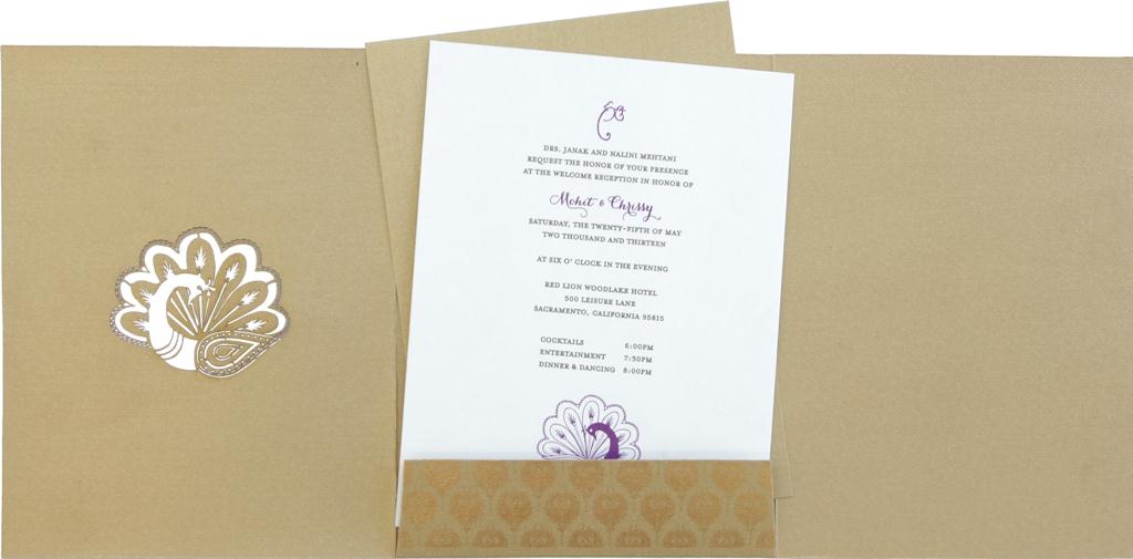 This sleek and classic invitation card is made of shimmery finish golden sheet. The front of this amazing invitation card has a laser cut design of Peacock. A golden printed Peacock feather on envelop & its matching inserts are simply captivating.