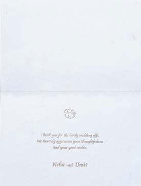 A well designed white color handmadepaper thank you card with top opening, comes with matching inside card with golden text in raised effect,is option to print.